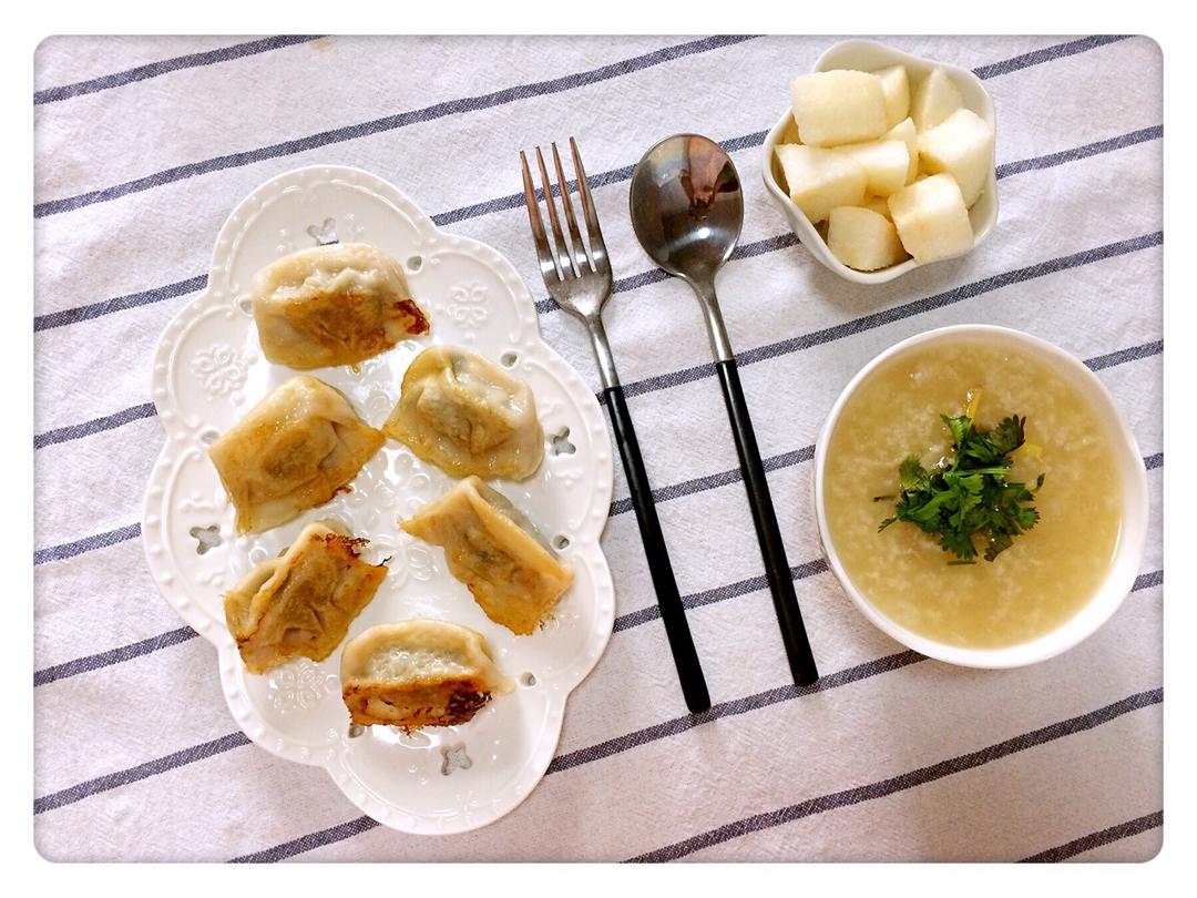 ^_^ 2017.5.16 美味鱼片粥+煎饺+雪梨。姐妹俩越来越喜欢腻歪在一起了😄