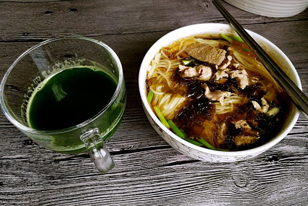 爱永恒2 做过 早餐•2017年5月17日 #早餐•2017年5月17日# 张先生做的早餐是这样的,永远都是面,不过煮面是他最拿手的,味道杠杠的! 起床就到阳台收割小麦草,榨汁就成了健康的饮料,有草腥味,微甜。野外挖的野生薄荷让婆婆给种活了,夏天用来泡水喝,拍照装高大上都少不了它。厨友们,早安!!🌷🌷 2017-05-17