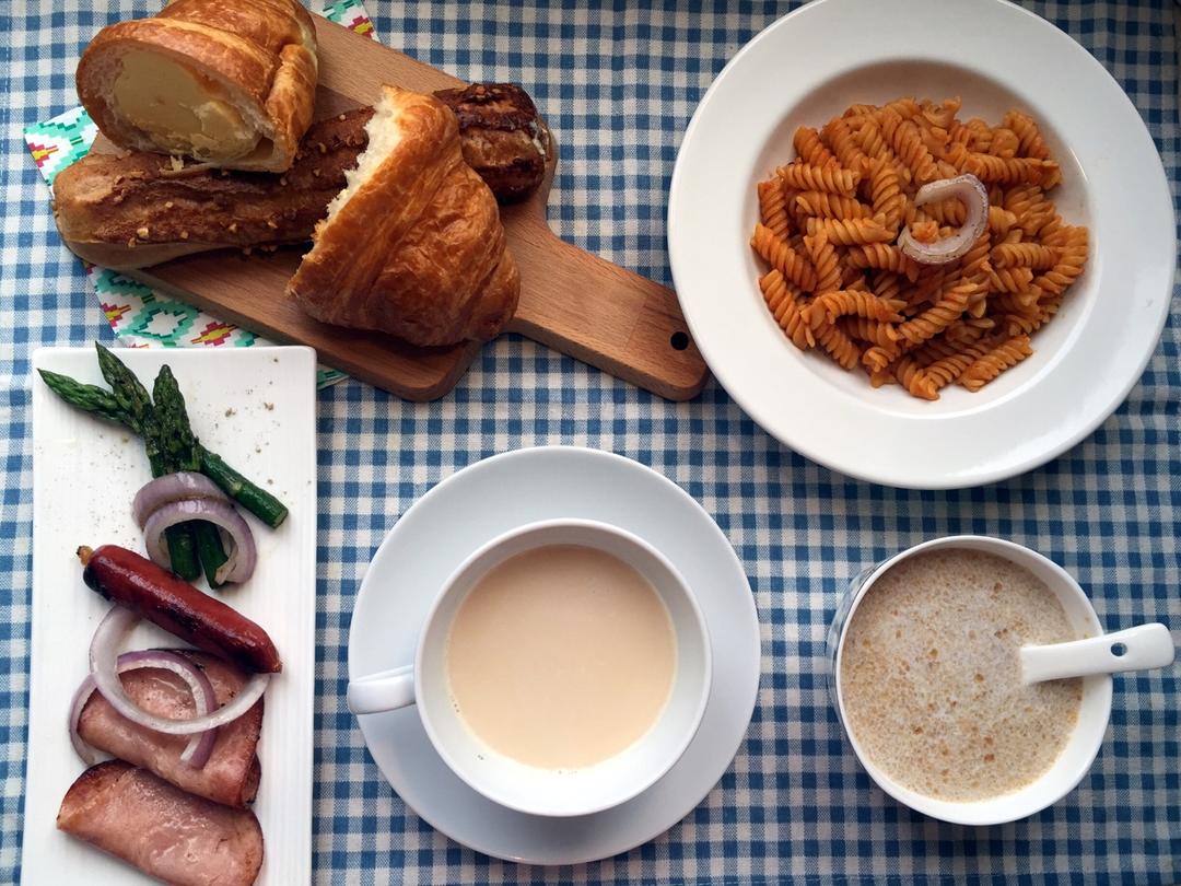 徐曼曼爱做早餐 做过 早餐•2017年5月22日 "甜品,是我见过最用心的情书"周一,早。。[微笑](甜都东京的:杏仁闪电泡芙、蛋黄和芝士的牛角可颂、推荐泡芙。肉酱意面、芦笋煎肠、奶茶、麦片) #早餐•2017年5月22日# 2017-05-22