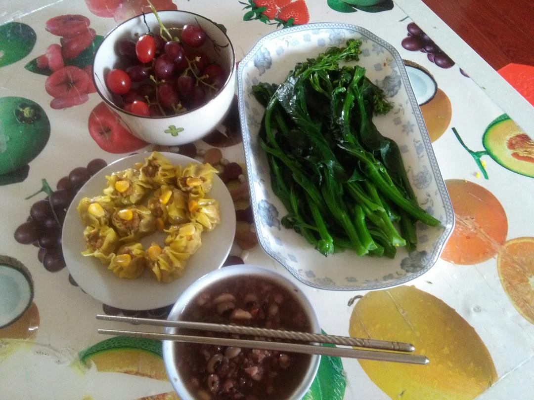 一个人的午餐,早餐吃剩的,加个油菜和水果