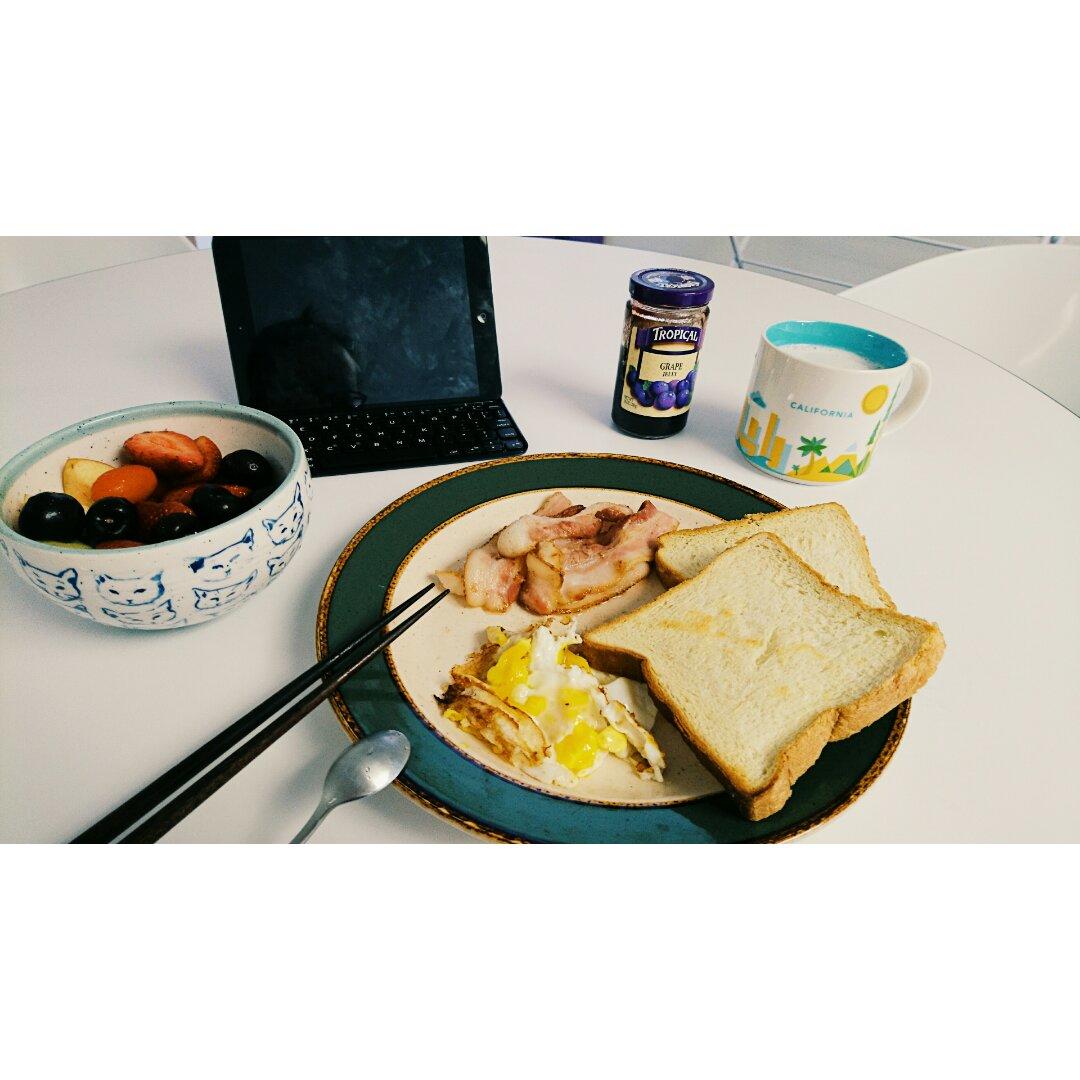 香蕉牛奶(搅拌机重回江湖!)+用烤箱烤了烤的吐司+煎费了的荷包蛋+培根+水果沙拉。啊,少了咖啡噗!😱