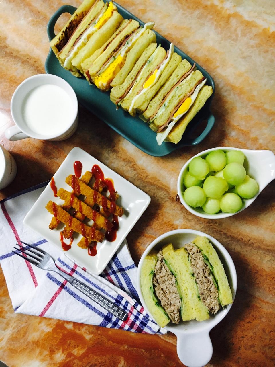 火腿芝士蛋三文治,金枪鱼三明治,炸猪排,热牛奶,水果。