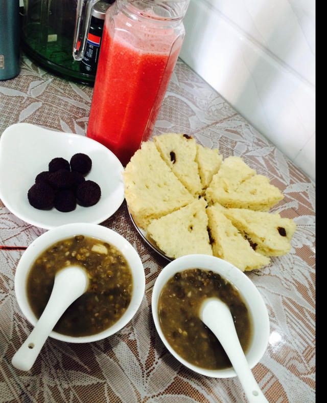 绿豆莲心+发糕(没成功,面粉比例少了)味还不错🙈+西瓜汁杨梅~今天有人请吃大餐,早餐凑合😇