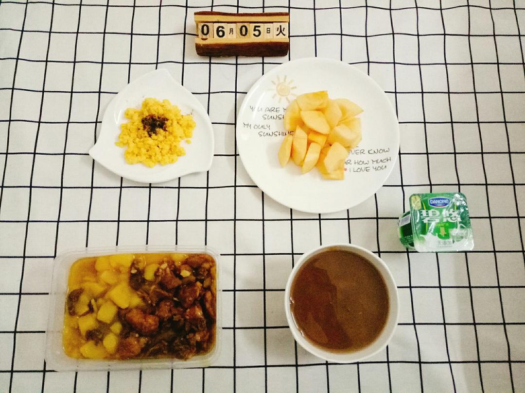 咖喱土豆排骨盖浇饭+scrambled egg+苹果+酸奶+绿豆汤✌