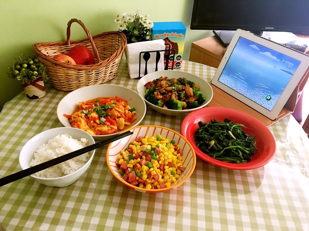 番茄炒蛋,玉米三色丁,清炒菠菜,西兰花油焖虾。