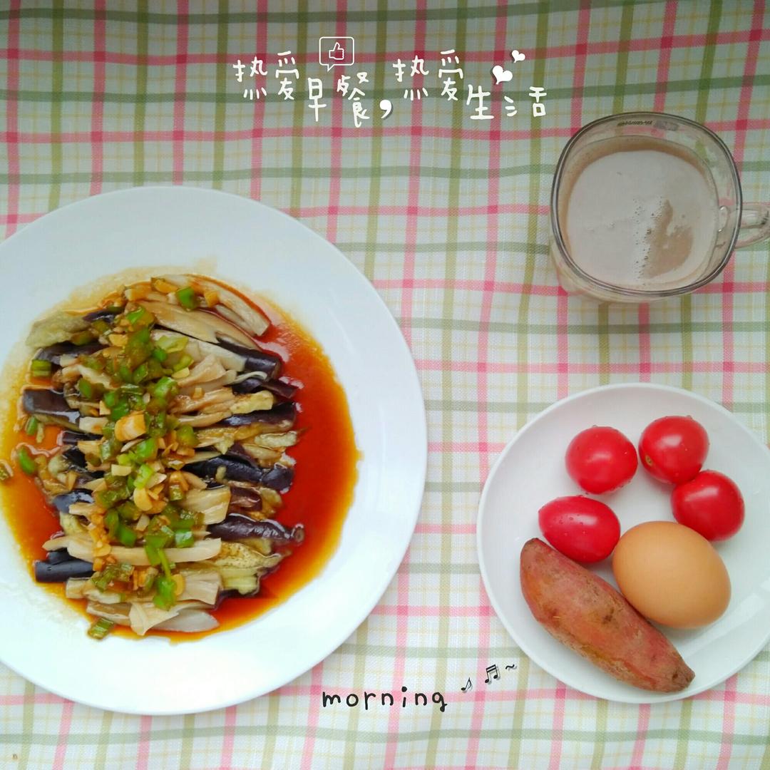 蒸茄子、杏鲍菇、黄心红薯,水煮蛋,五谷豆浆!