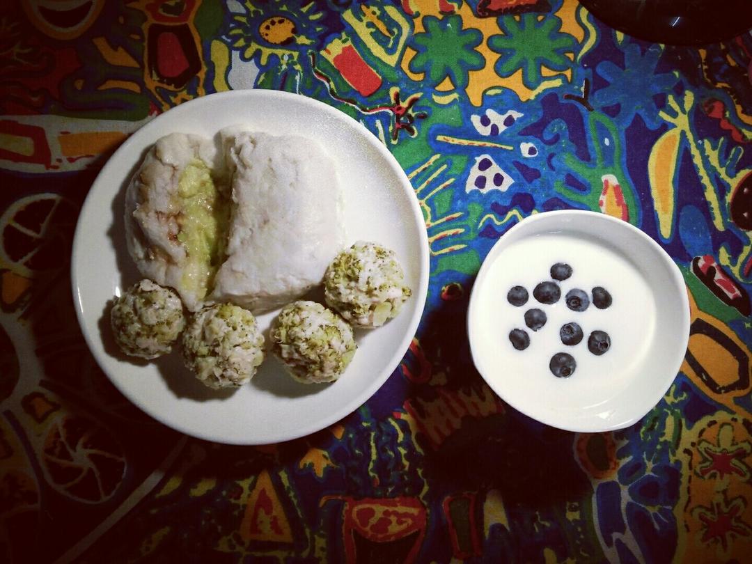 任真mm 做过 早餐•2017年6月13日 #早餐•2017年6月13日##寝室#肚子里有料的但颜值有待加强的芋头糕,香蕉牛油果泥和豆沙,鸡胸肉西兰花丸子,拯救不是特别爱吃西兰花的我 ,蓝莓酸奶~静静等着我的榨汁机滴到来~ 2017-06-13