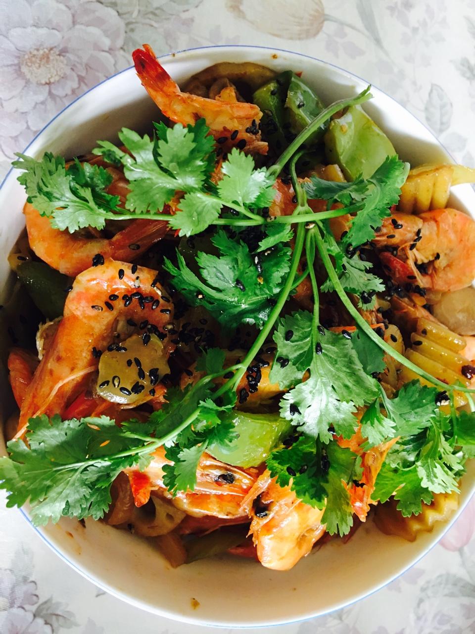 今天中午尝试做了干锅大虾,蚝油生菜,颜值不高,将就了看看吧