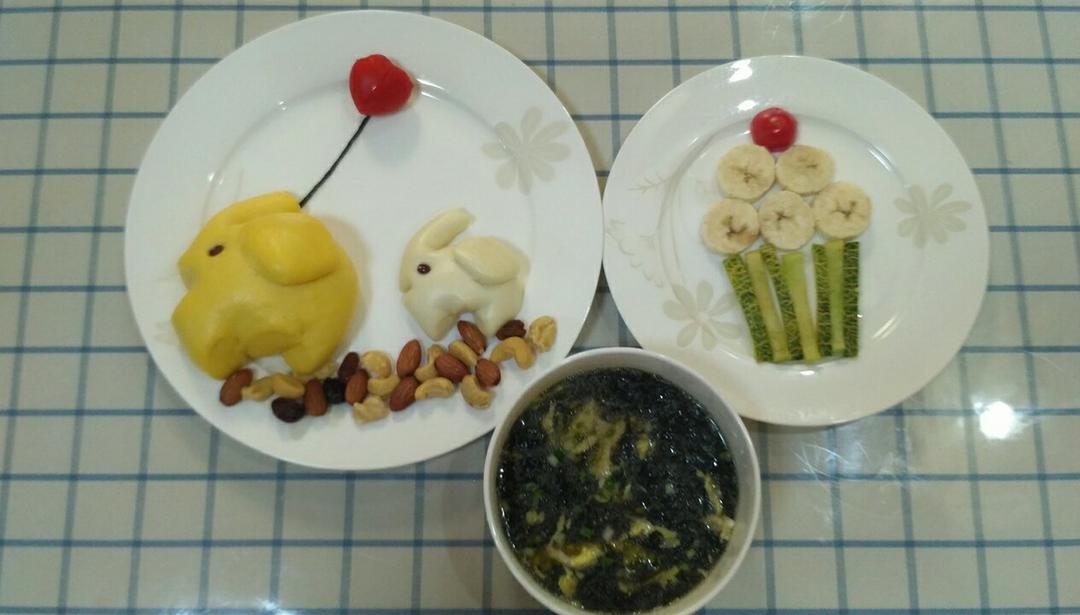 【记录早餐】小象馒头+坚果+水果拼盘+紫菜蛋汤