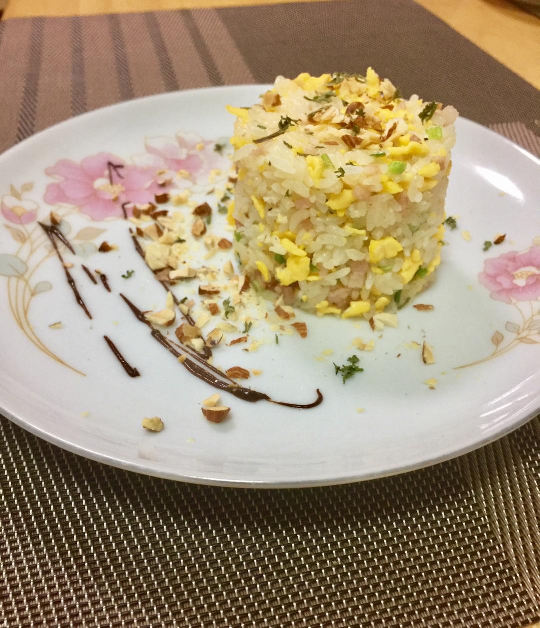 Mary小栈 做过 晚餐•2017年6月28日 培根切丁,配料是鸡蛋。用黄油炒的米饭,出锅前撒上黑胡椒碎。拿慕斯圈给炒饭造型,撒上果仁碎和欧芹末,餐盘上用巧克力酱拉花。 #晚餐•2017年6月28日##培根炒饭# 2017-06-28