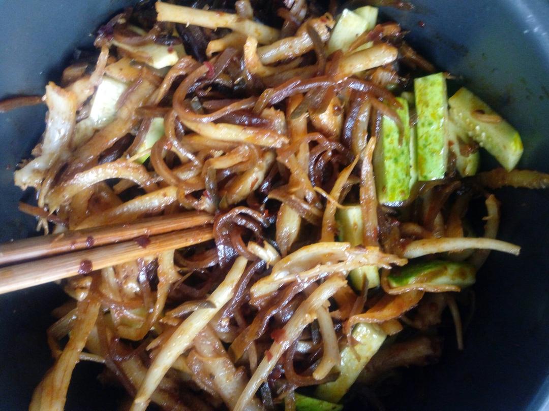 咸菜桔梗黄瓜拌。特别有食欲,吃了两碗饭