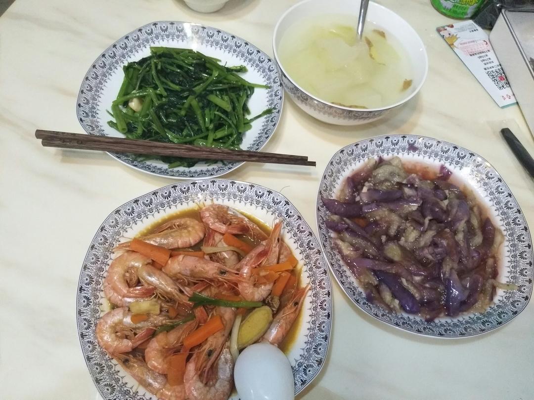 红烧虾,清炒空心菜,伴茄子,冬瓜汤~
