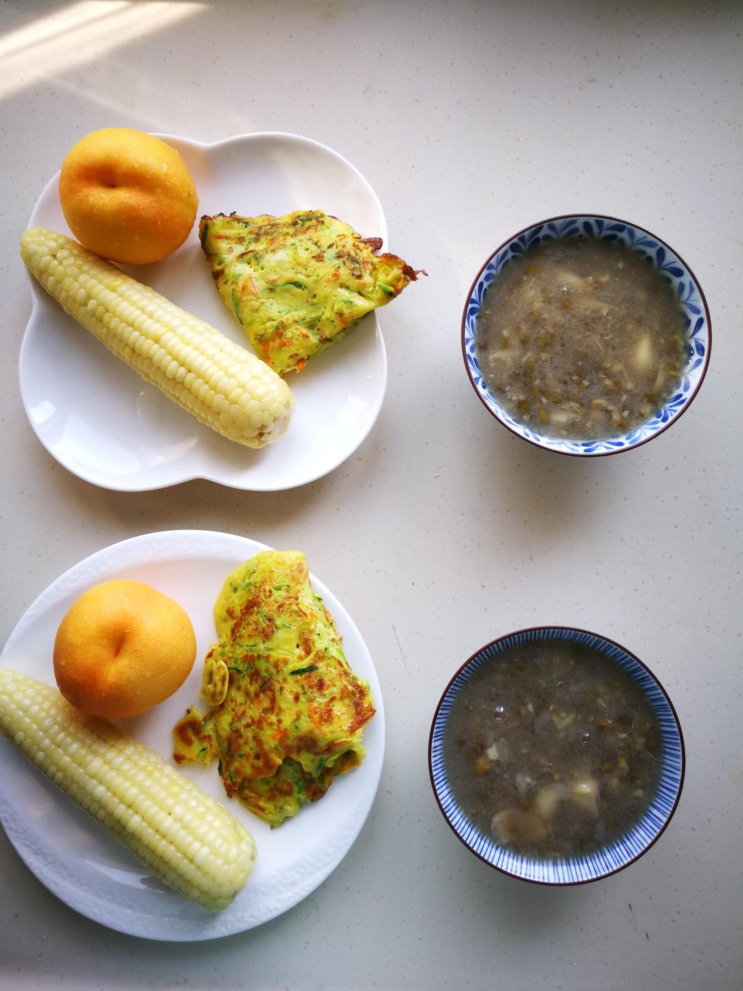 南瓜煎饼,玉米,油桃,绿豆百合汤