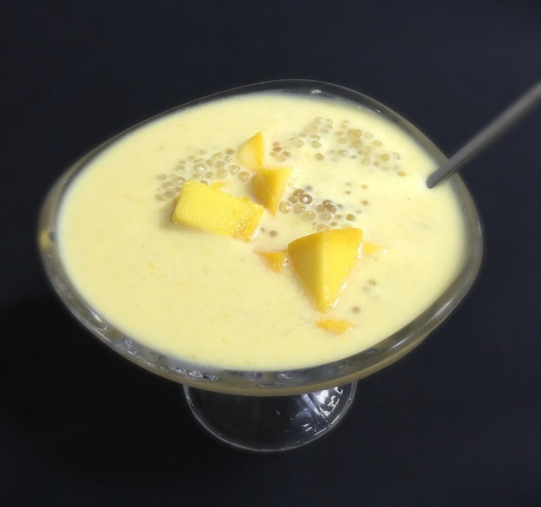 100克西米开水下锅,大火煮开五分钟关火焖至西米没有白芯捞出过凉水。半个芒果肉加一盒牛奶料理机打匀加入过凉的西米,再放入剩余的一半芒果肉👌