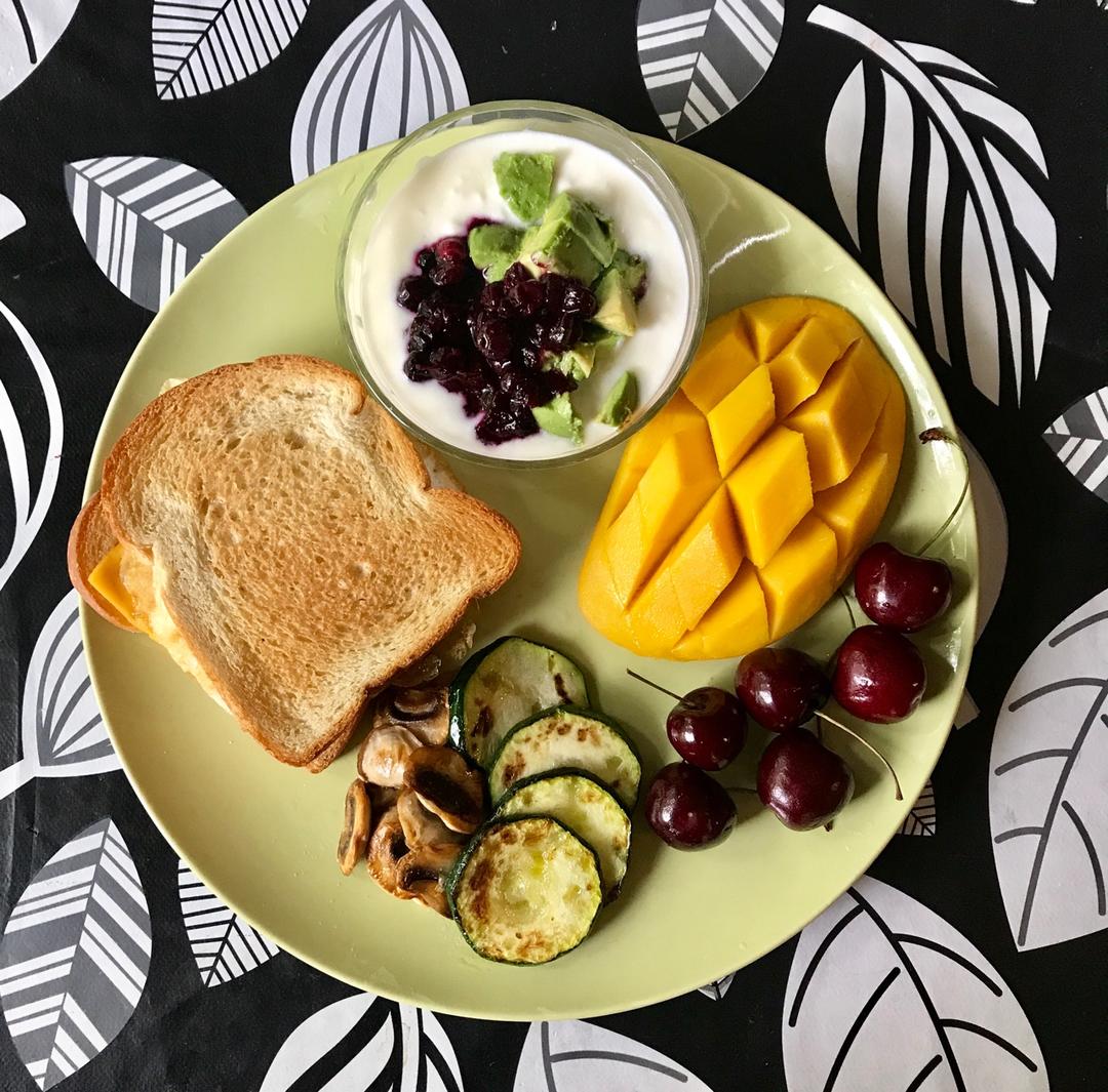 【早安,暖暖】20170723 :鸡蛋三明治,煎口蘑、青瓜,芒果、樱桃,蓝莓果酱酸奶。