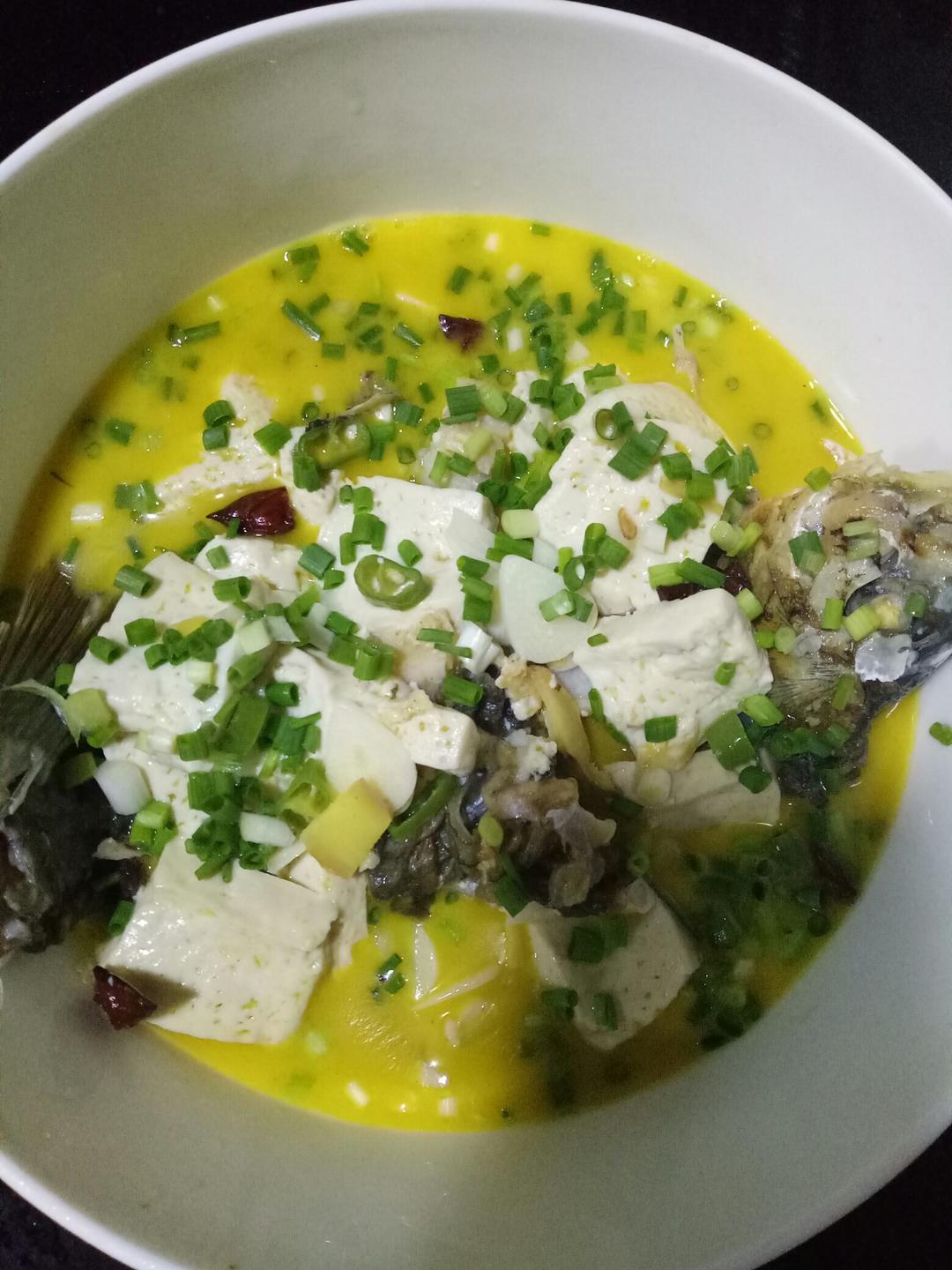 金黄色的,虽然没成奶白色但也超级好喝。晚餐就一个人吃了这一碗鱼。给自己点个赞。棒棒哒