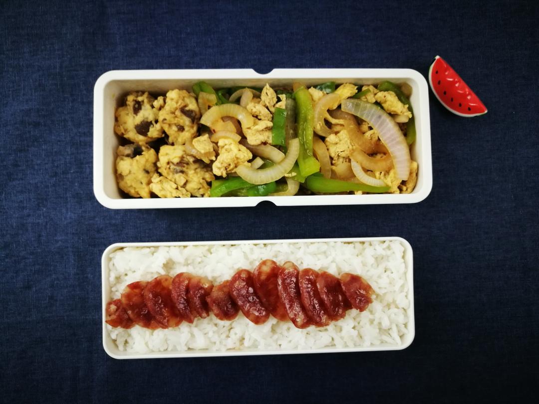 腊肠饭,青椒洋葱炒蛋,香菇鸡肉丸子