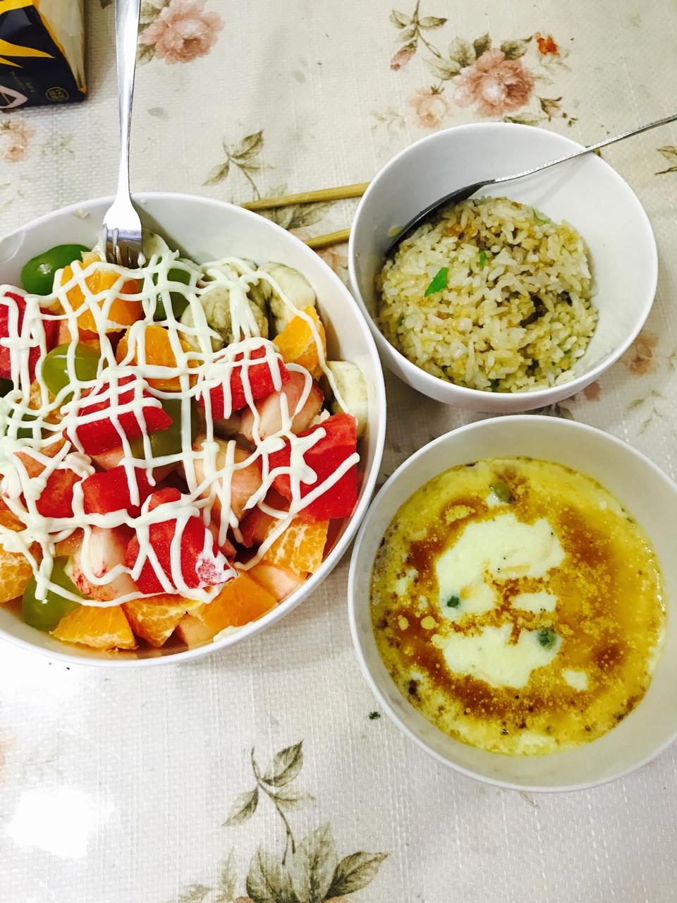 家里的水果都加到沙拉里了,下回还是用酸奶拌热量会低一点!