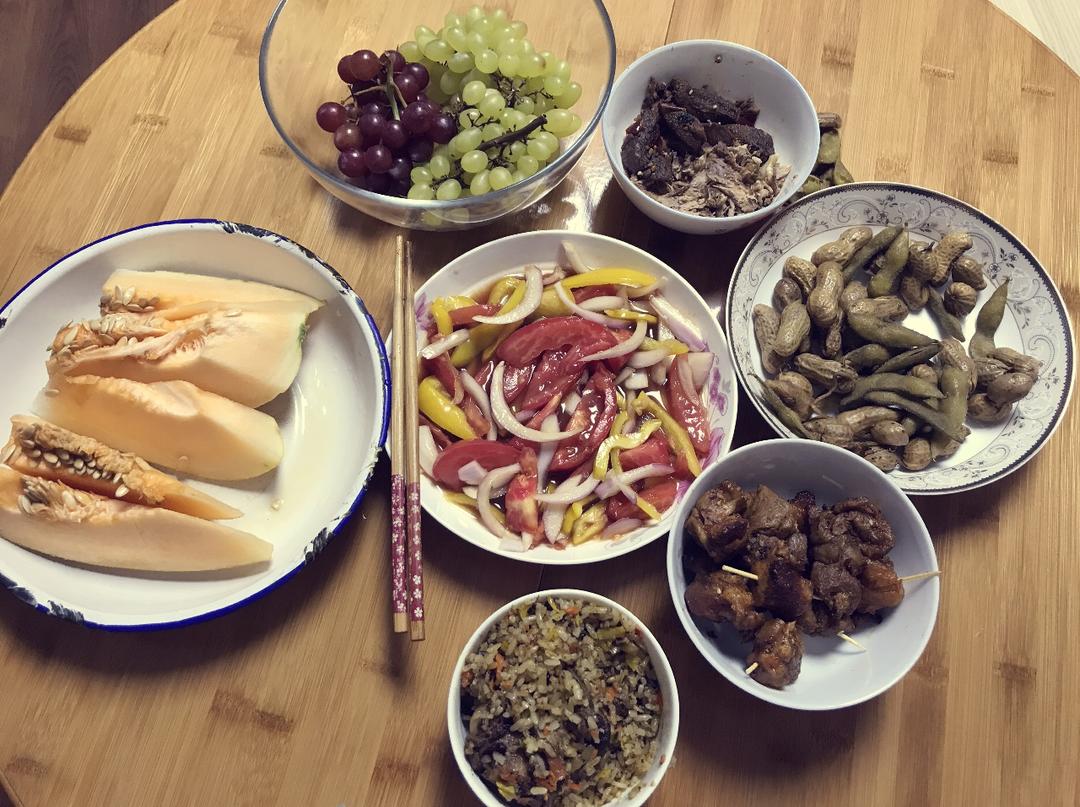 么么茶爱阳光 做过 午餐•2017年8月17日 假装在新疆:抓饭,烤肉,牛肉干,还有葡萄和甜瓜都是我辛辛苦苦从乌鲁木齐空运过来的😂😂😂自己再拌个皮辣红,没有青椒了,用彩椒代替。老公吃的歹歹的 #午餐•2017年8月17日# 2017-08-17