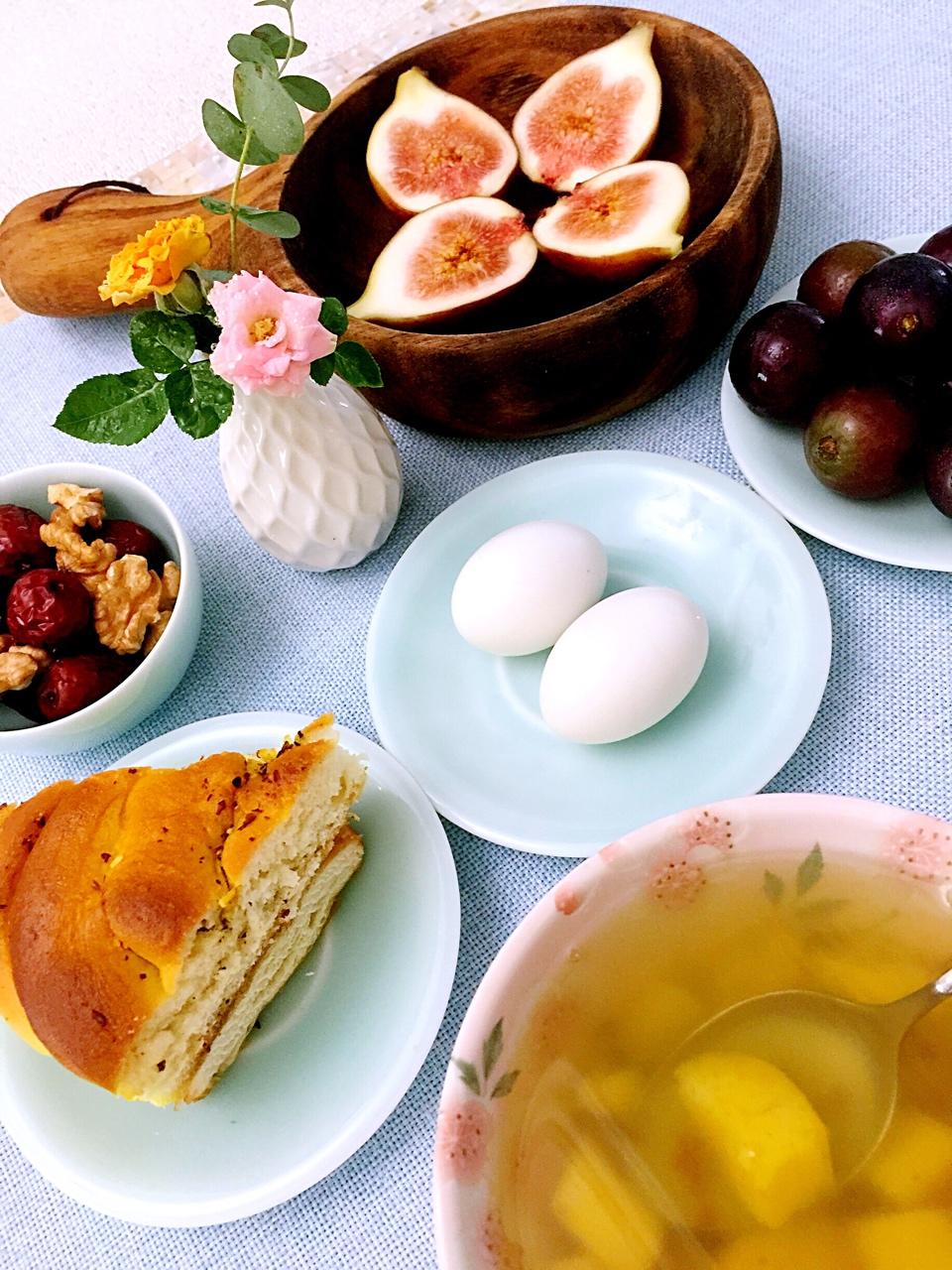 友人兰州带来的清真饼、鸽子蛋、桂花小香薯汤、水果、坚果,营养丰富的哈……