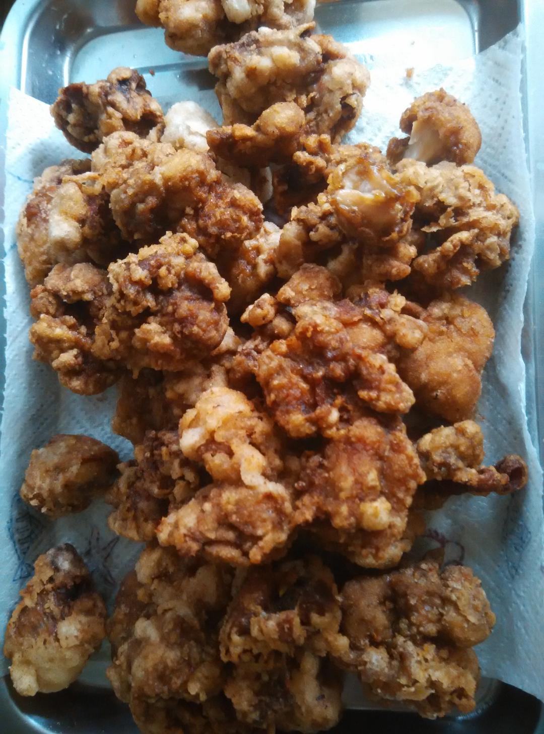 自己腌制,加了些咖喱粉!最后裹上淀粉,超级好吃,秒杀外面炸鸡店