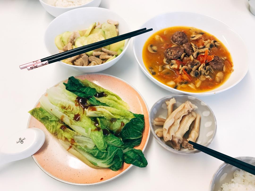 【8月23日晚餐】番茄蘑菇炖牛肉丸+蚝油生菜+西葫芦炒肉丝+醉鹅掌