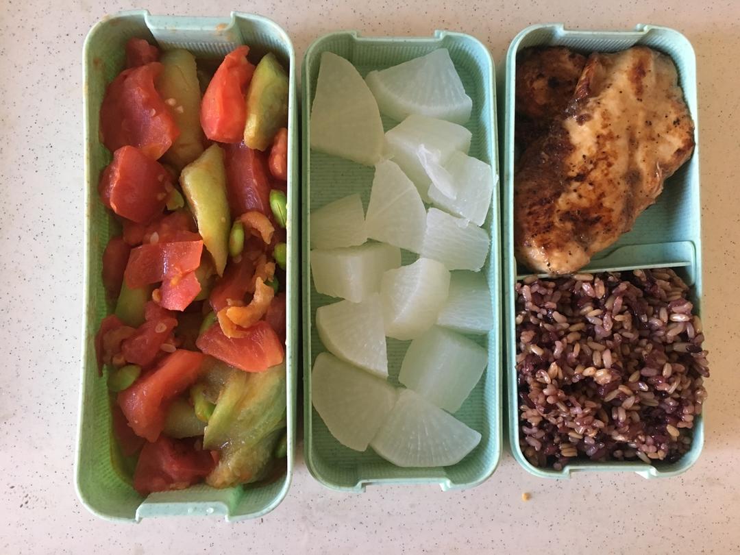 丽丽安00 做过 午餐•2017年8月28日 萝卜隔夜煮熟,打算中午泡速食的紫菜汤微波炉转做汤。丝瓜毛豆番茄,丝瓜应该先腌下或者开水卤下的,烧了好久才软。继续煎鸡胸(黑胡椒味)。 #午餐•2017年8月28日# 2017-08-28