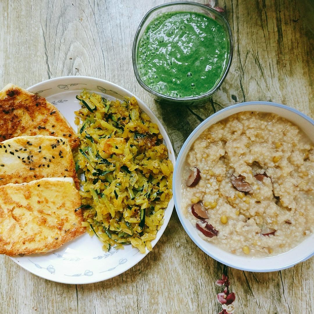 鸡蛋馒头片 清炒南瓜丝 小米绿豆粥 菠菜香蕉酸奶