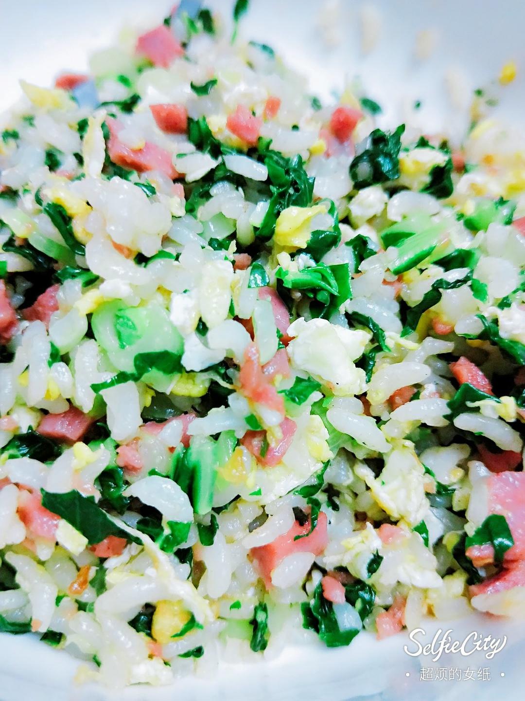 青菜叶、鸡蛋、肉肠、剩饭,蚝油调节咸淡,完美!