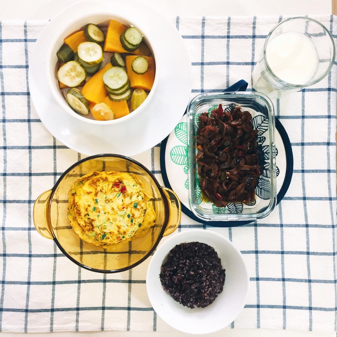 螺丝椒鸡胗,黄瓜摊鸡蛋,蒸黄瓜蒸山芋,糙米黑米白米饭。