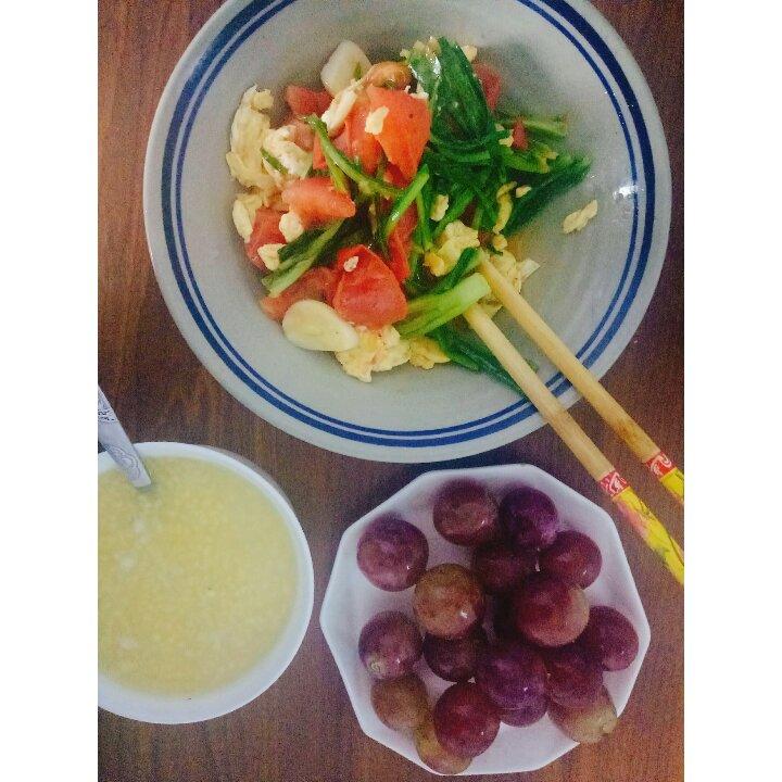 好久没发早餐啦,家里剩的菜随便炒炒,煮了玉米薏米粥