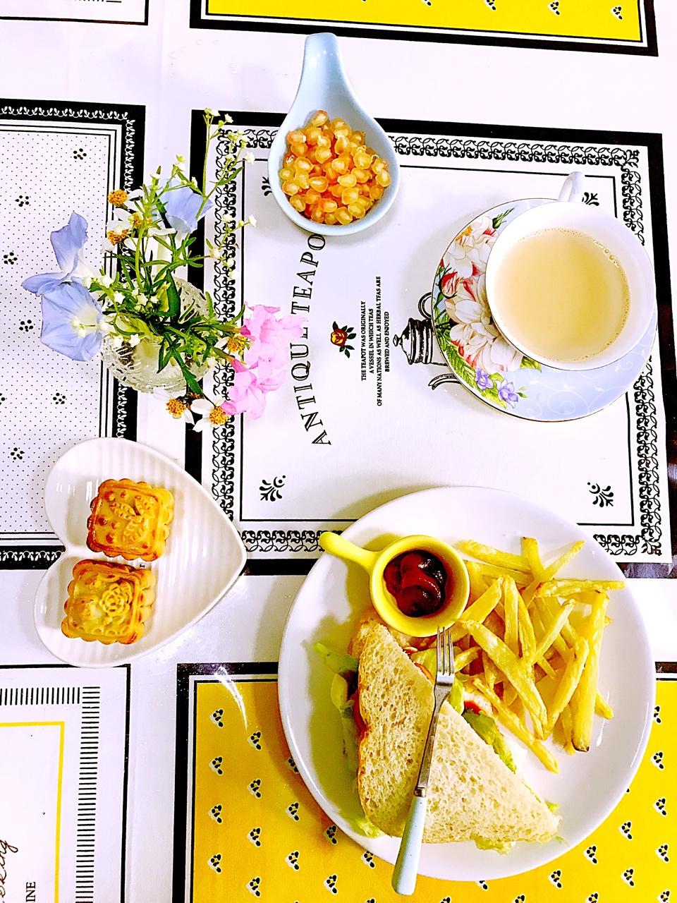 今日早餐,煎蛋三明治,空气炸锅版炸薯条,自制奶茶,回油尚未完成的椰蓉蔓越莓月饼,石榴。
