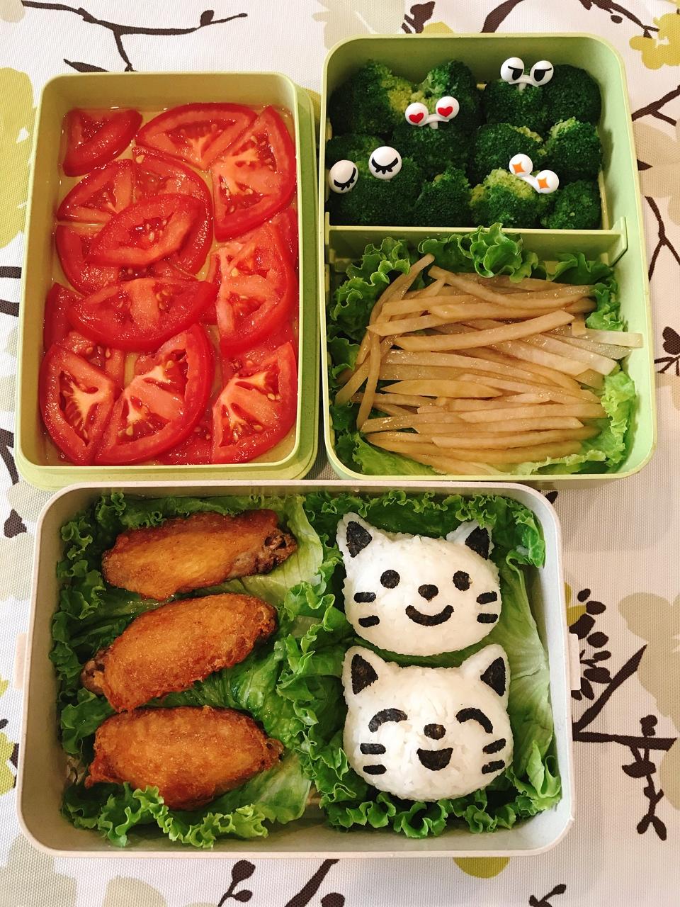 猫咪饭团+盐焗烤鸡翅+蚝油西兰花+糖醋土豆丝+糖拌番茄