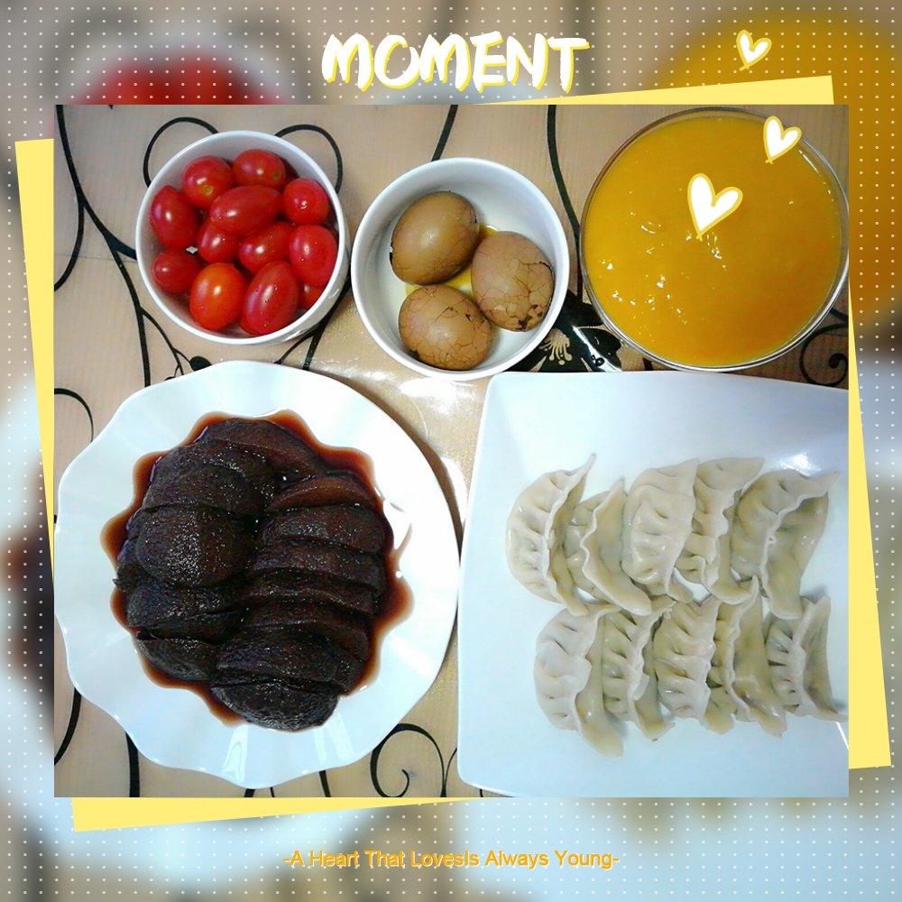 胡萝卜黑木耳玉米肉糜水饺+南瓜糊+红酒雪梨+煮鸡蛋+小番茄🍅