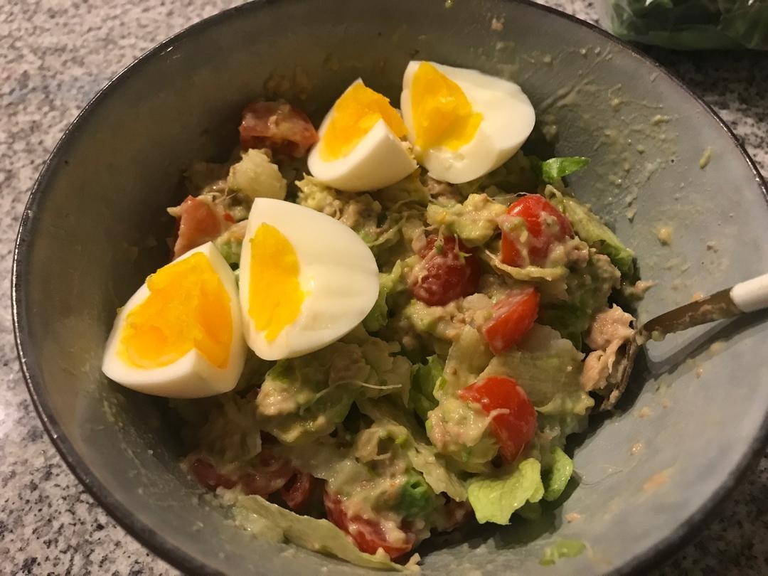 晚饭是沙拉,加了番茄土豆生菜牛油果金枪鱼鸡蛋,看起来很健康,但卡路里很高的晚饭