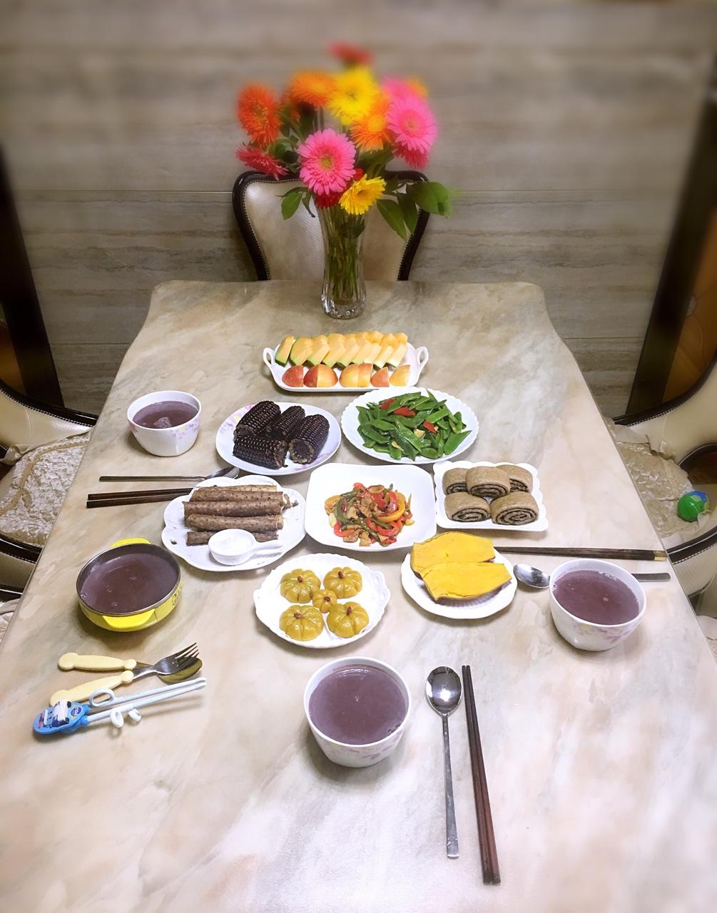 颖晓麻麻 做过 早餐•2017年10月1日 假期第一天👨👩👧👦早餐荞麦黑芝麻葱油卷南瓜豆沙馅糯米团黑糯玉米 铁棍山药炒芸豆和肉片炒彩椒蒸地瓜和杂粮米糊 #早餐•2017年10月1日# 2017-10-01