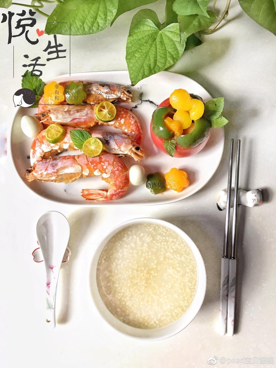 烤海虾干 贡米燕麦粥 彩椒蚬肉番茄盅 #早餐•2017年10月1日#