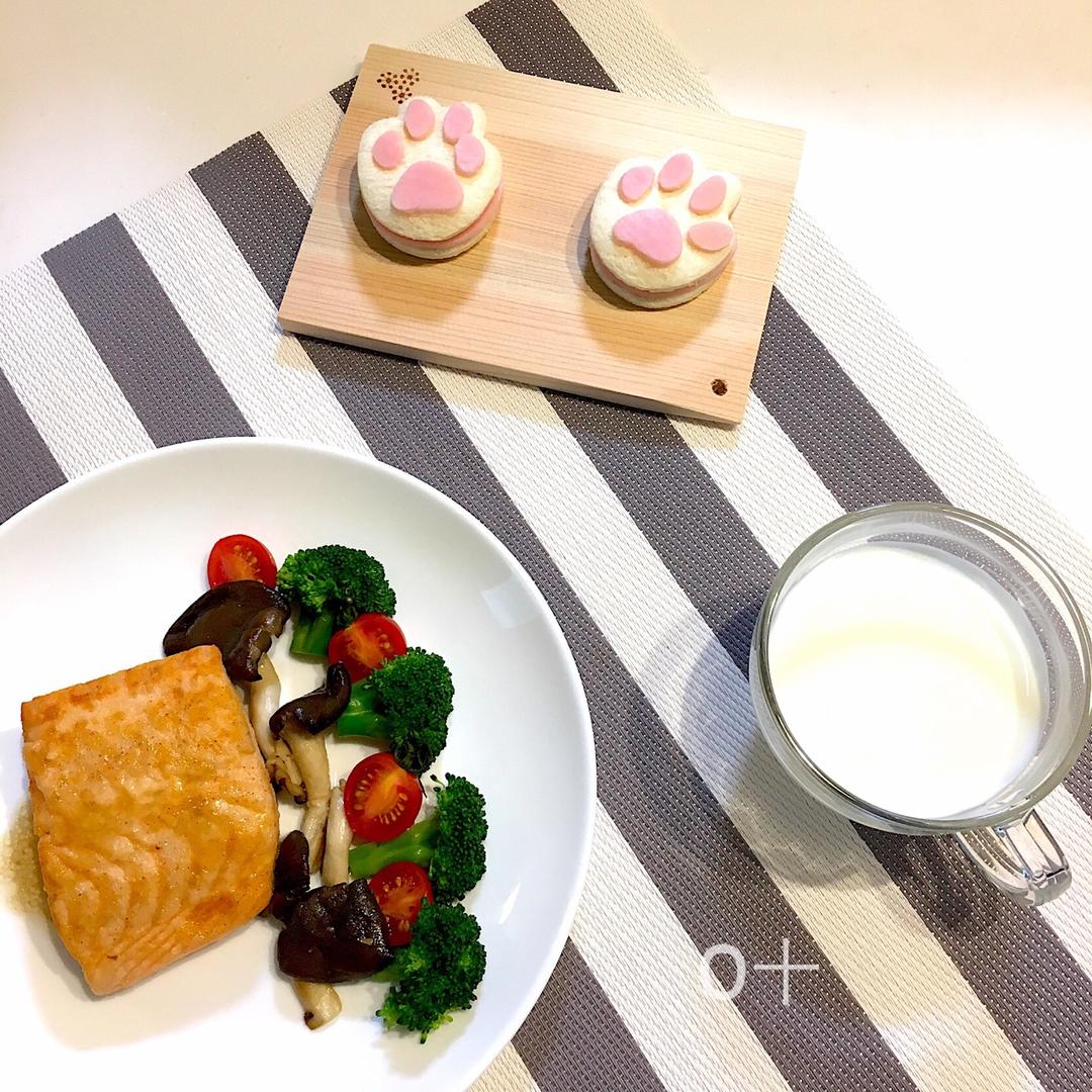 【天天晒早餐😋】火腿肉球三明治,香煎三文鱼,平菇,西兰花,迷你番茄🍅,牛奶🥛