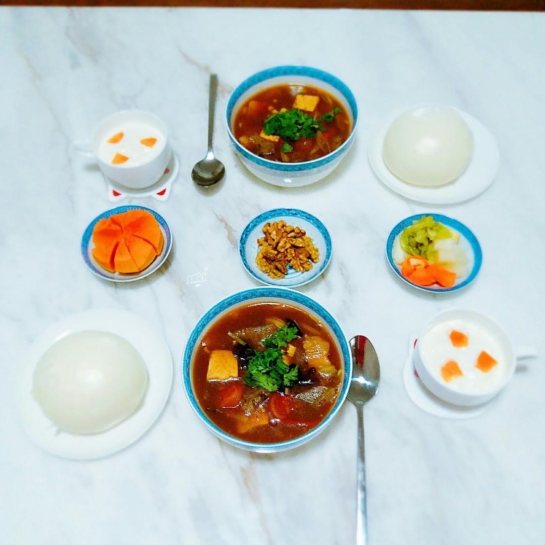 雨竹麻麻 做过 早餐•2017年10月20日 #早餐•2017年10月20日#早餐#小碗汤(五花肉片,白莲豆,蘑菇,油豆腐,嫩豆腐,番茄,黑木耳,扁剁)+馒头+水果酸奶杯+自制泡菜+核桃仁+脆柿子。洛阳的美食小碗汤酸辣祛湿,主要以陈醋和胡椒粉提味,汤做好出锅前撒上蒜黄和香菜口感更清香。天冷喝上一碗浑身冒汗,活力充沛。[偷笑][偷笑] 2017-10-20
