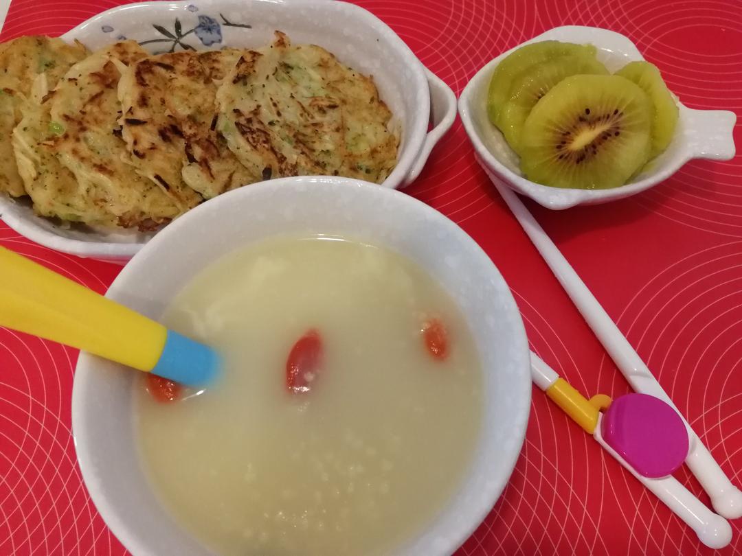 一个懒人 做过 早餐•2017年10月27日 #早餐•2017年10月27日#做好早餐闺女又睡着了😂本来想做藕饼,发现家里藕坏了,做了土豆丝饼,放了点西兰花,小米燕麦粥放了几个枸杞,一个红心猕猴桃 2017-10-27