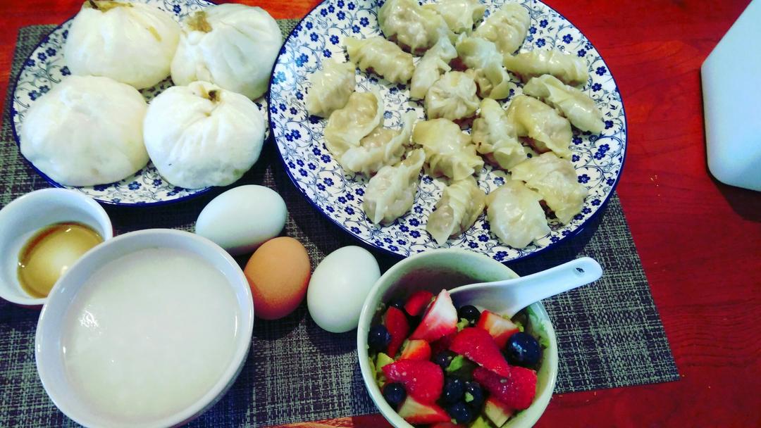 蒸饺,水果沙拉,包子,白粥配咸蛋。