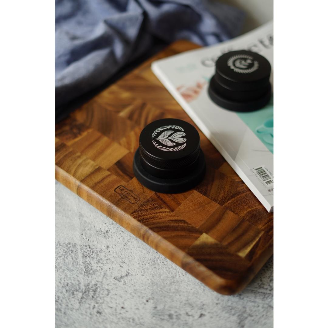最近到手的泰国相思木砧板左右摆弄了一下,发现拿来放这两个东西顺便操作压粉还比较不错。因为下面有四个小胶垫比较防滑,压粉时候不会滑动。需要清洁时候拖动砧板到桌子边缘,压粉时候掉落的咖啡粉貌似比较方便用刷子清扫。