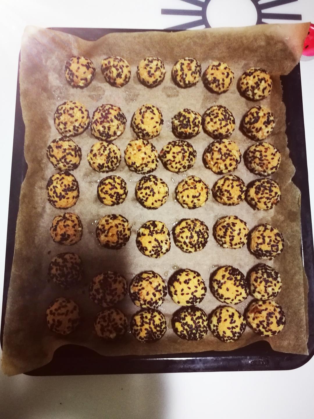 换了黑芝麻,没有白的,很香甜,烤20分钟远不够,又加20分钟,好吃!