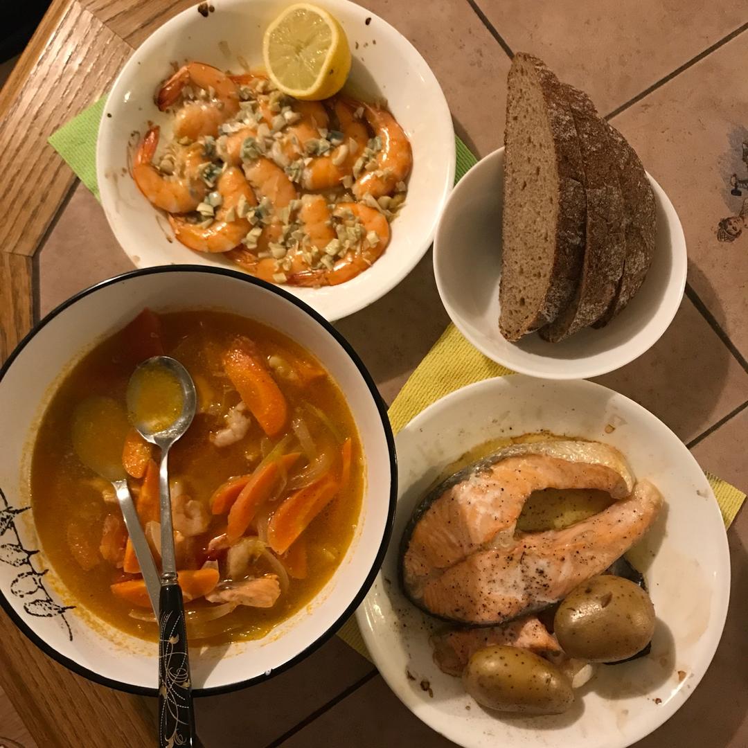 蒜烤大虾,三文鱼汤配黑麦面包~