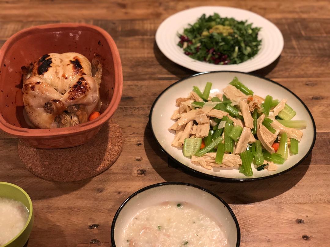 生滚鸡粥,烤鸡,拌腐竹芹菜,Kale沙拉