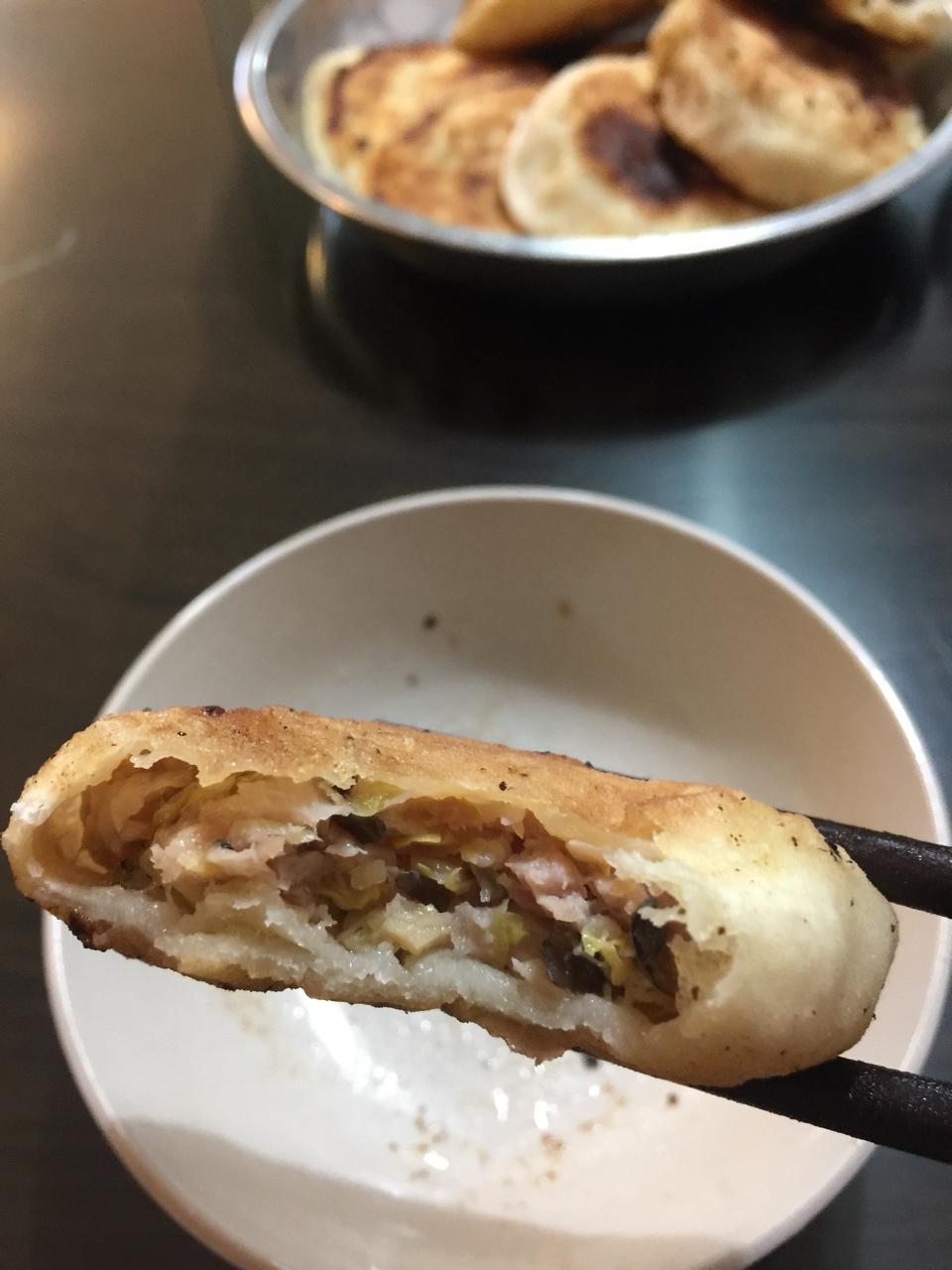 包饺子剩的馅,和点面,(半烫面)包的馅饼。......面又剩了,再烙几张饼吃