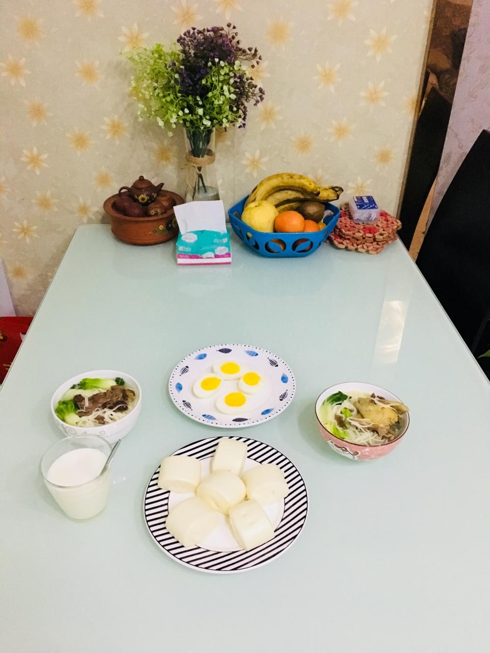 鸽子汤青菜面、牛奶、奶香小馒头、煮蛋