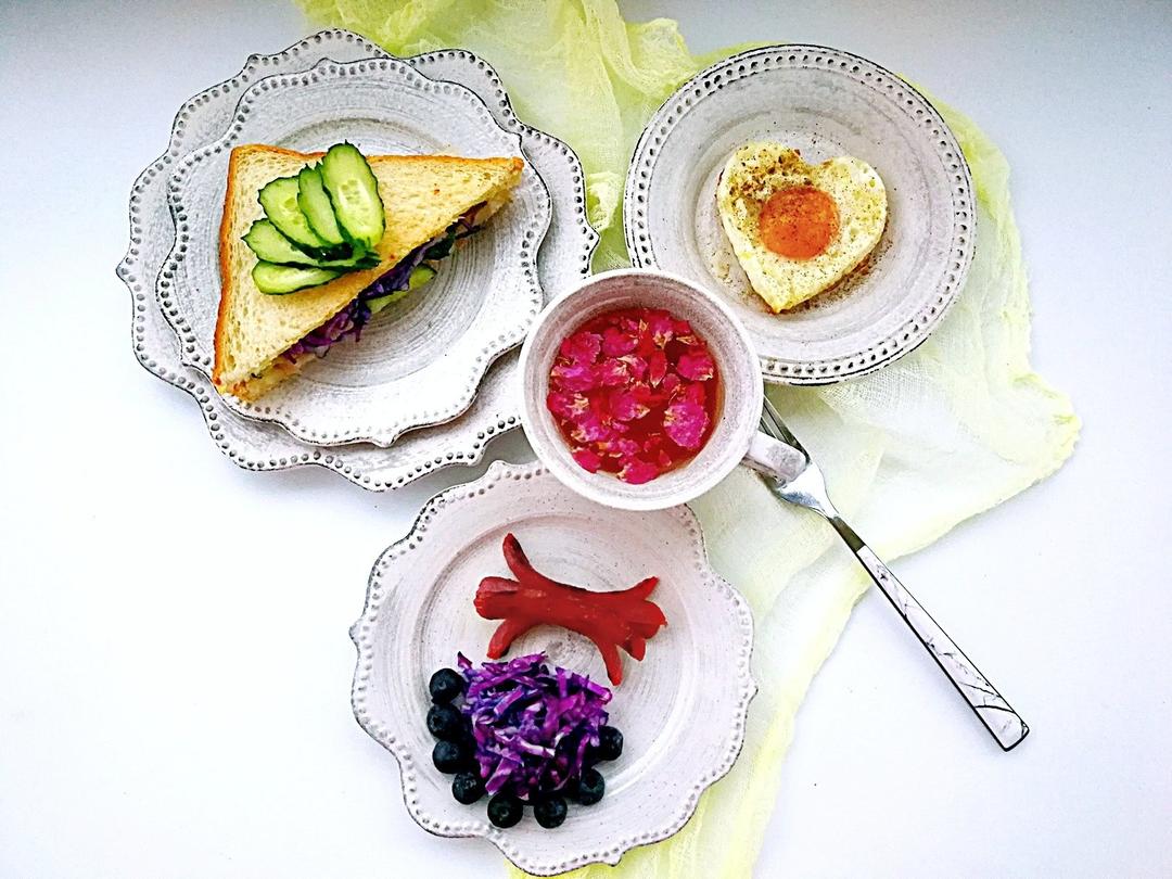 风聆梅朵朵 做过 健康饮食明天会更好 #早餐•2017年12月29日##爱心妈妈早餐系列##2017我在下厨房#2017年10月29日星期五爱心早餐😊 金枪鱼三明治、爱心煎蛋、烤开花脆皮肠、紫甘蓝沙拉、玫瑰花果醋和蓝莓。 2017-12-29