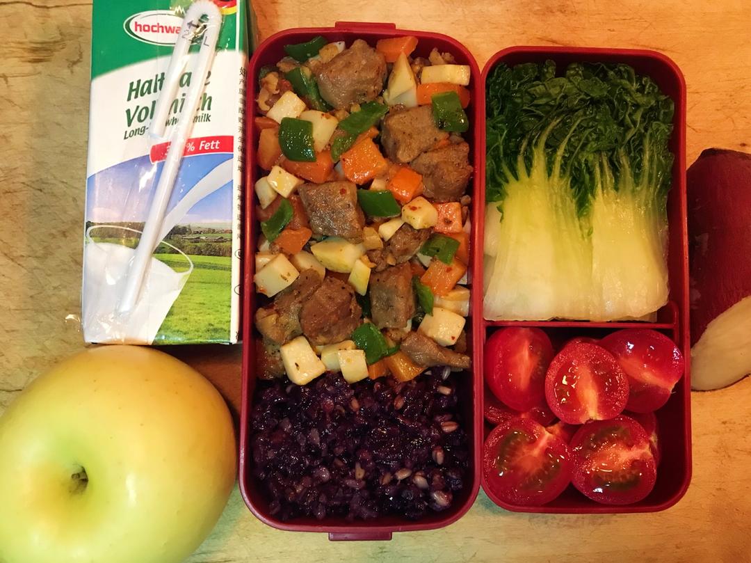 花_痴 做过 午餐•2018年1月9日 冷,真的很容易饿,不自觉发现最近带的🍱也越来越硬,这还不算另外带的牛奶、鸡蛋、🍠、🌽,这个可以高热不长肉的季节!主餐:时蔬牛肉粒+紫米杂粮饭,配餐:奶白菜+🍅,冬天里的苹果更好吃一些! #午餐•2018年1月9日##姜大花的一人食# 2018-01-09