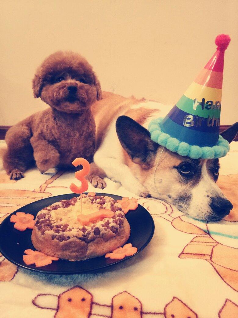 给狗儿做的2蛋紫薯戚风撒肉丁盖马苏里拉顶。低糖无盐超级香。三岁生日快乐哦😊